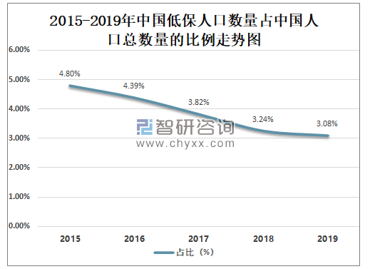随着中国经济的飞速发展,中国低保人口数量占中国人口总数量的比例逐年减少,2019年中国低保人口数量占中国人口总数量的3.08%,较2015年的4.80%减少了1.72%。