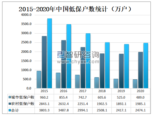 2020年中国低保户数达2474.1万户,较2019年增加了57万户,其中城市低保户数为489万户,较2019年减少了36万户;农村低保户数为1985.1万户,较2019年增加了93万户。