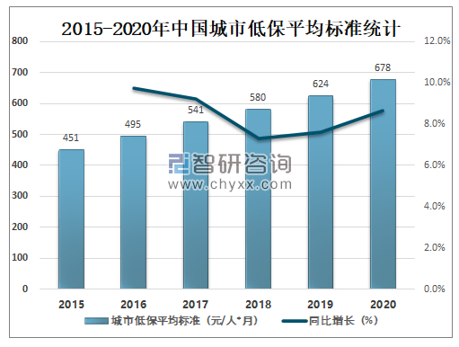 随着中国最低生活保障制度的普及,近年来中国城市低保平均标准逐年增加,2020年中国城市低保平均标准达678元/人*月,较2019年增加了54元/人*月,同比增长8.7%。