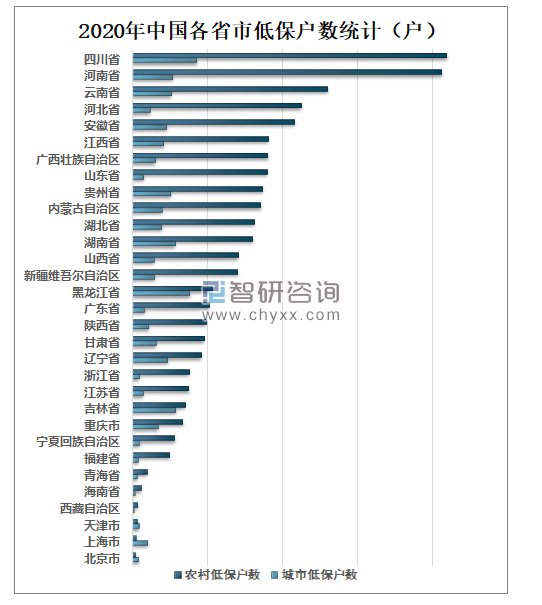 2020年四川省城市低保户数为429932户,全国排名第一;黑龙江省城市低保户数为381907户,全国排名第二;吉林省城市低保户数为289902户,全国排名第三。四川省农村低保户数为2091464户,全国排名第一;河南省农村低保户数为2060565户,全国排名第二;云南省农村低保户数为1301785户,全国排名第按。
