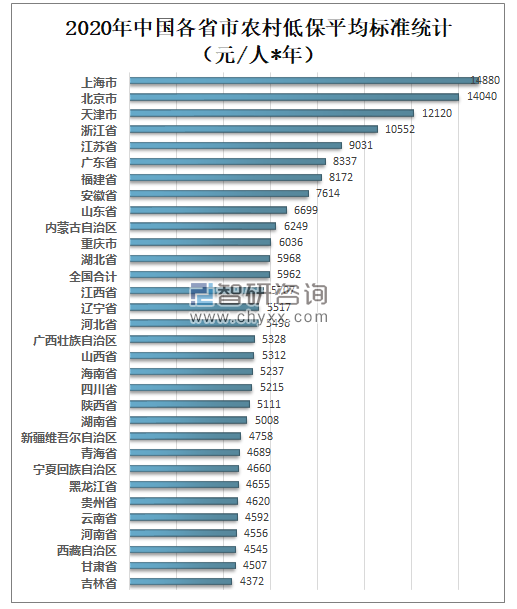 2020年上海市农村低保平均标准为14880元/人*年,居全国最高水平;北京市农村低保平均标准为14040元/人*年;天津市农村低保平均标准为12120元/人*年。