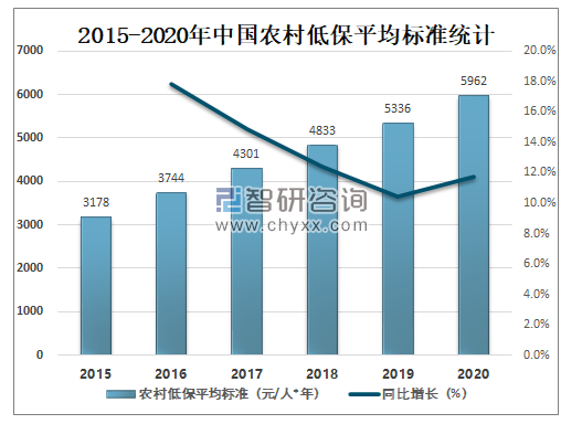 2020年中国农村低保平均标准达5962元/人*年,较2019年增加了626元/人*年,同比增长11.7%。