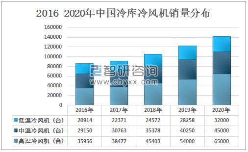 由于冷风机在高温领域的应用优势,高温冷风机冷库虽然起步晚,但发展速度快,目前不管是销量还是年增长率都已经超过了中低温冷库。2020年低温冷风机销量为32000台,中温冷风机销量为45000台,高温冷风机销量为65000台。