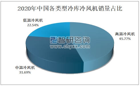 智研咨询发布的《2021-2027年中国冷风机产业竞争现状及发展趋势分析报告》数据显示:2020年中国高温冷风机销量占冷库冷风机总销量的45.77%,中温冷风机销量占冷库冷风机总销量的31.69%,低温冷风机销量占冷库冷风机总销量的22.54%。