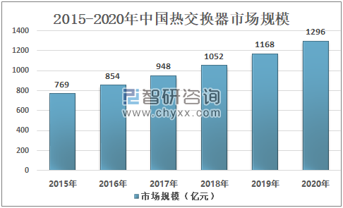 换热器由于在化工、石油、动力和原子能等工业部门的广泛应用,其市场规模不断扩大。2019年中国热交换器市场规模约为1168亿元,2020年中国热交换器市场规模为1296亿元左右。