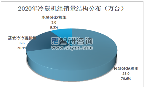 2020年风冷冷凝机组销量为23万台,占冷凝机组总销量的70.6%;蒸发冷凝机组销量为6.6万台,占冷凝机组总销量的20.1%;水冷冷凝机组销量为3万台,占冷凝机组总销量的9.3%。