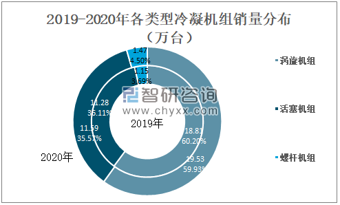 中国冷凝机组销量主要以涡旋机组为主,2020年涡旋机组销量为19.53万台,占冷凝机组总销量的59.93%;活塞机组销量为11.59万台,占冷凝机组总销量的35.57%;螺杆机组销量为1.47万台,占冷凝机组总销量的4.5%。
