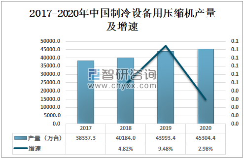 智研咨询发布的《2021-2027年中国冷凝机组行业市场深度分析及投资前景趋势报告》数据显示:2017-2020年中国制冷设备用压缩机产量不断增加,2020年中国制冷设备用压缩机产量为45304.4万台,较2019年的43993.4万台同比增长2.98%。