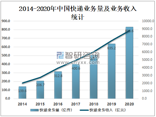 快递行业作为邮政业的重要组成部分,具有带动产业领域广、吸纳就业人数多、经济附加值高、技术特征显著等特点。它将信息传递、物品递送、资金流通和文化传播等多种功能融合在一起,关联生产、流通、消费、投资和金融等多个领域,是现代社会不可替代的基础产业。近年来中国快递业务量及业务收入快速增长,2020年中国快递业务量达833.6亿件,快递业务收入达8795.4亿元。