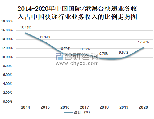 自2019年起中国国际/港澳台快递业务收入占中国快递行业业务收入的比例逐年攀升,2020年中国国际/港澳台快递业务收入占中国快递行业业务收入的12.20%,较2019年增长了2.23%。