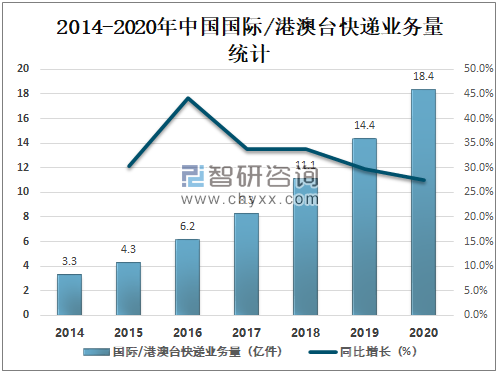 近年来中国在世界经济中的地位逐渐上升,加入WTO更加刺激了中国经济的发展,由此带来的制造业和零售业的繁荣。将会使对快递业国际业务的需求进一步增大。2020年中国国际/港澳台快递业务量达18.4亿件,较2019年增加了3.95亿件,同比增长27.5%。