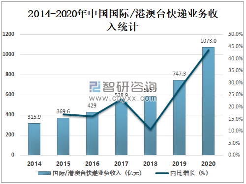 随着中国国际/港澳台快递业务量的增加,业务收入也随着增长,2020年中国国际/港澳台快递业务收入达1073亿元,较2019年增加了325.74亿元,同比增长43.6%。