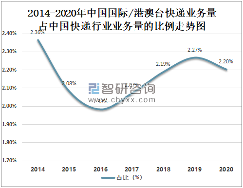 智研咨询发布的《2021-2027年中国快递行业市场全景调查及发展趋势研究报告》数据显示:自2017年起中国国际/港澳台快递业务量占中国快递行业业务量的比例逐年攀升,2020年受新冠肺炎疫情影响,中国国际/港澳台快递业务量占中国快递行业业务量的比例有所下滑,2020年中国国际/港澳台快递业务量占中国快递行业业务量的2.20%,较2019年减少了0.07%。