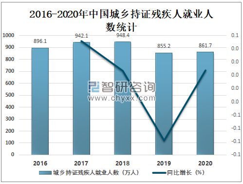 残疾人就业不仅能体现残疾人自身的价值,也是残疾人参与和融入社会的主要方式,更是推动残疾人精准扶贫的重要路径。2020年中国城乡持证残疾人就业人数达861.7万人,较2019年减少了6.5万人,同比减少0.76%。