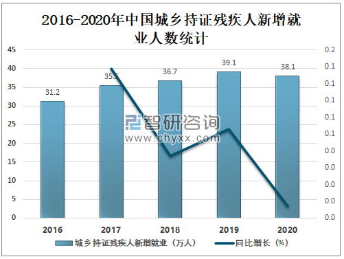 近年来中国城乡持证残疾人新增就业人数逐年增加,2019年中国城乡持证残疾人新增就业人数达39.1万人,较2018年增加了2.4万人,同比增长6.54%,2020年较2019年有所下滑,2020年中国城乡持证残疾人新增就业人数为38.1万人,较2019年减少了1万人,同比减少2.56%。