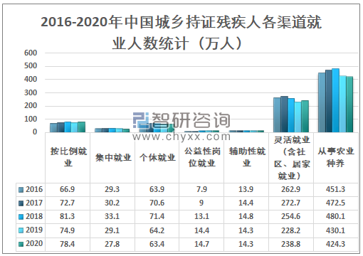 2016-2020年中国城乡持证残疾人各渠道就业人数统计(万人)