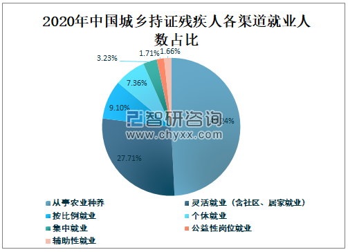2020年中国城乡持证残疾人从事农业种养人数占中国城乡持证残疾人就业总人数的49.24%,占比最大;灵活就业(含社区、居家就业)人数占中国城乡持证残疾人就业总人数的27.71%;按比例就业人数占中国城乡持证残疾人就业总人数的9.10%;个体就业人数占中国城乡持证残疾人就业总人数的7.36%;集中就业人数占中国城乡持证残疾人就业总人数的3.23%;公益性岗位就业人数占中国城乡持证残疾人就业总人数的1.71%;辅助性就业人数占中国城乡持证残疾人就业总人数的1.66%。