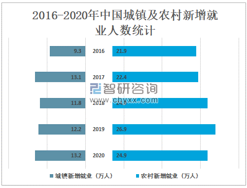 2020年中国城镇新增就业人数为13.2万人,较2019年增加了1万人;农村新增就业人数为24.9万人,较2019年减少了2万人。