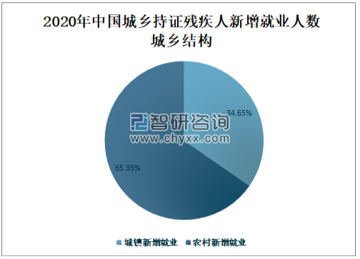 2020年中国农村新增就业人数占中国城乡持证残疾人新增就业总人数的65.35%,占比较大;城镇新增就业人数占中国城乡持证残疾人新增就业总人数的34.65%,占比较小。