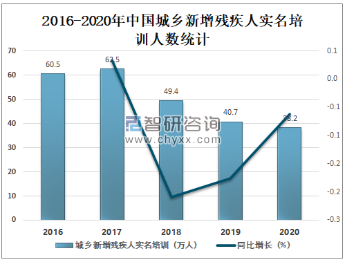 2016-2020年中国城乡新增残疾人实名培训人数统计