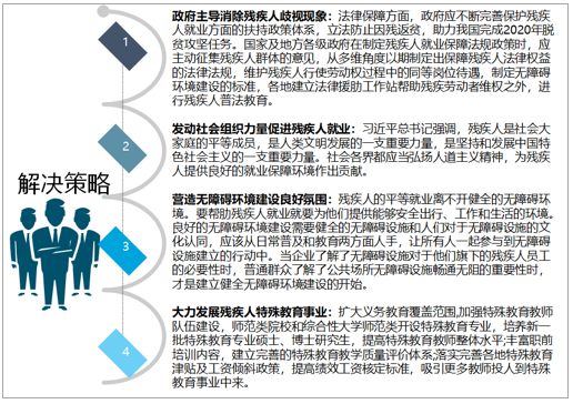 面对残疾人就业存在的问题,解决策略主要有:政府主导消除残疾人歧视现象;发动社会组织力量促进残疾人就业;营造无障碍环境建设良好氛围;大力发展残疾人特殊教育事业等。