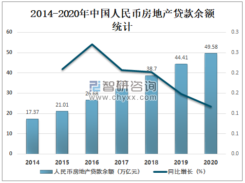 智研咨询发布的《2021-2027年中国房地产行业市场现状调研及投资机会预测报告》数据显示:近年来中国人民币房地产贷款余额逐年攀升,2020年中国人民币房地产贷款余额达49.58万亿元,较2019年增加了5.17万亿元,同比增长11.64%。