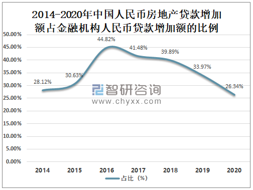 自2017年起中国人民币房地产贷款增加额占金融机构人民币贷款增加额的比例逐年下滑,2020年中国人民币房地产贷款增加额占金融机构人民币贷款增加额的26.34%,较2019年减少了7.63%。