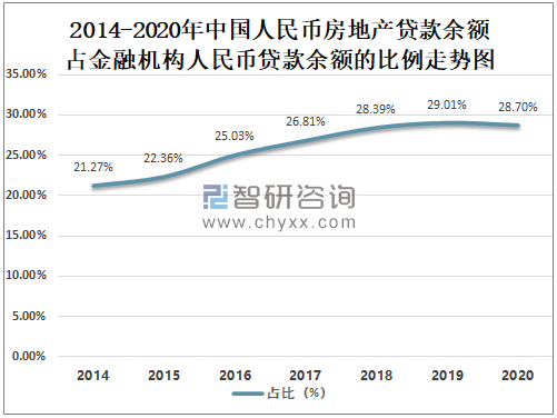自2015年起中国人民币房地产贷款余额占金融机构人民币贷款余额的比例逐年攀升,2019年中国人民币房地产贷款余额占金融机构人民币贷款余额的29.01%,较2018年增加了0.61%,2020年较2019年有所下滑,2020年中国人民币房地产贷款余额占金融机构人民币贷款余额的28.70%,较2019年减少了0.30%。