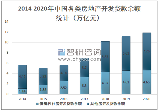 2020年中国保障性住房开发贷款余额达4.65万亿元,较2019年增加了0.04万亿元;其他房开发贷款余额达7.26万亿元,较2019年增加了0.65万亿元。