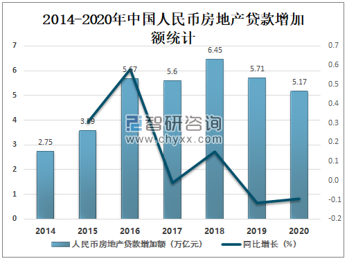 自2019年起中国人民币房地产贷款增加额逐年减少,2020年中国人民币房地产贷款增加额为5.17万亿元,较2019年减少了0.54万亿元,同比减少9.46%。