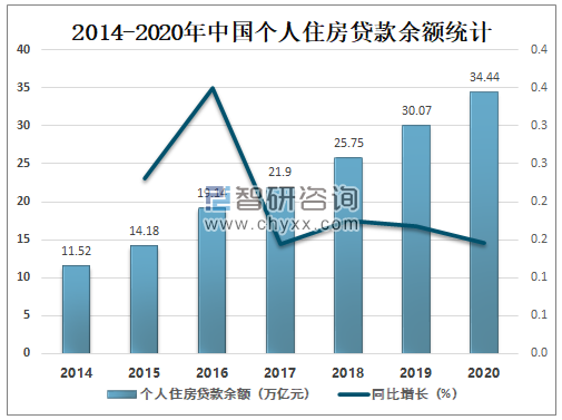自2015年起中国个人住房贷款余额逐年增加,2020年中国个人住房贷款余额达34.44万亿元,较2019年增加了4.37万亿元,同比增长14.53%。