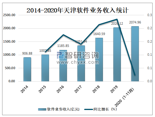天津市软件产业近几年一直保持稳步增长态势,软件业务收入不断取得新突破。2019年天津软件业务收入达2026.12亿元,较2018年增加了385.53亿元,同比增长23.50%,2020年1-11月天津软件业务收入已完成2074.96亿元,已超过2019年全年。