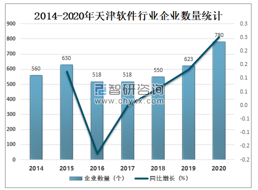 天津市软件产业在经济社会发展和信息化建设的强力驱动下,保持了良好的发展势头,呈现产业规模扩大、产业结构合理、企业实力增强、聚集效应明显等特点,基本形成了以园区为载体、以企业为主体、以创新产品为特色的发展格局,逐渐成为天津市经济发展的新的增长点。2020年天津软件行业企业数量达780个,较2019年同期增加了157个,同比增长25.20%。