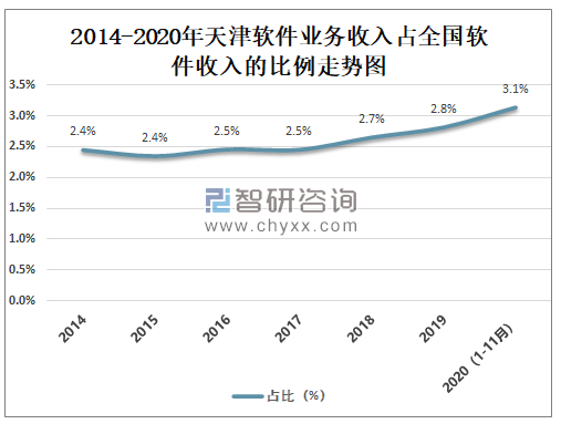 智研咨询发布的《2021-2027年中国软件行业市场发展潜力及投资盈利分析报告》数据显示:总体来看天津软件业务收入占全国软件收入的比例呈增长趋势,2020年1-11月年天津软件业务收入占全国软件收入的3.1%,较2014年的2.4%增长了0.7%。
