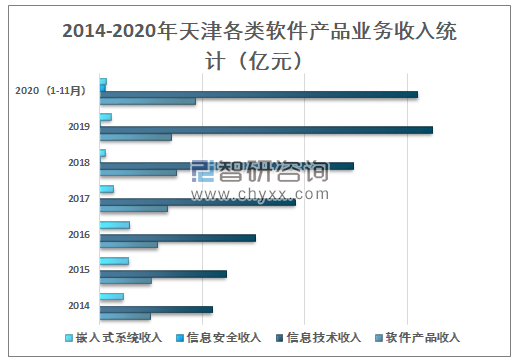 2020年1-11月天津软件产品收入为467.29亿元;信息技术收入为1549.74亿元;信息安全收入为25.82亿元;嵌入式系统收入为32.11亿元。