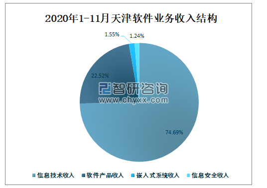 2020年1-11月天津信息技术收入占天津软件业务收入的74.69%,占比最大;软件产品收入占天津软件业务收入的22.52%;嵌入式系统收入占天津软件业务收入的1.55%;信息安全收入占天津软件业务收入的1.24%。