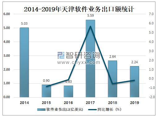 在出口方面,自2018年起天津软件业务出口额呈下滑趋势,2019年天津软件业务出口额为2.24亿美元,较2018年减少了0.4亿美元,同比减少15.20%。