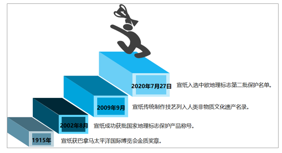 1915年,宣纸获巴拿马太平洋国际博览会金质奖章。2002年8月,宣纸成功获批国家地理标志保护产品称号。2009年9月,宣纸传统制作技艺列入人类非物质文化遗产名录。2020年7月27日,宣纸入选中欧地理标志第二批保护名单。