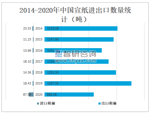 智研咨询发布的《2021-2027年中国宣纸行业市场全面调研及市场规模预测报告》数据显示:中国宣纸出口数量明显大于进口数量,中国是全球宣纸主要出口国之一,2020年中国宣纸进口数量为87.98吨,较2019年增加了69.55吨;出口数量为886.48吨,较2019年减少了680.52吨。