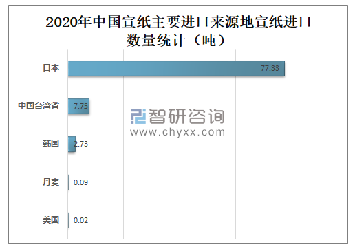 中国宣纸主要从日本、韩国、中国台湾省、丹麦、美国等地进口,2020年中国从日本进口宣纸77.329吨;从中国台湾省进口宣纸7.747吨;从韩国进口宣纸2.73吨;从丹麦进口宣纸0.09吨;从美国进口宣纸0.019吨。