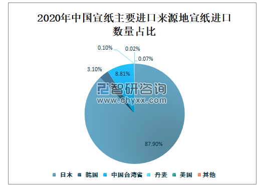 2020年中国从日本、韩国、中国台湾省、丹麦、美国五个国家/地区进口宣纸的进口数量总和占全国进口总数量的99.93%,其中中国从日本进口宣纸数量占全国进口总数量的87.90%,占比最大;从韩国进口宣纸数量占全国进口总数量的3.10%;从中国台湾省进口宣纸数量占全国进口总数量的8.81%;从丹麦进口宣纸数量占全国进口总数量的0.10%;从美国进口宣纸数量占全国进口总数量的0.02%。