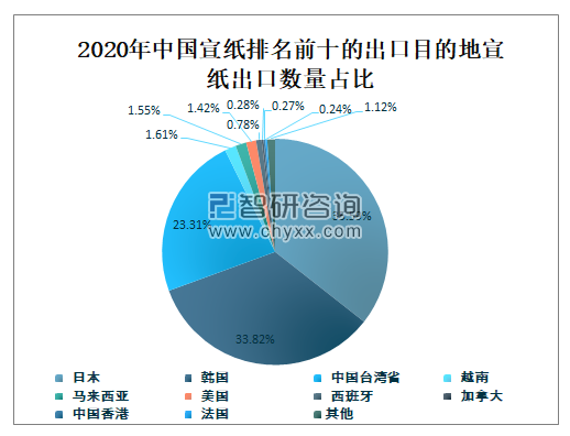 2020年中国出口至日本、韩国、中国台湾省、越南、马来西亚、美国、西班牙、加拿大、中国香港、法国的宣纸出口数量占全国出口总数量的98.88%,其中出口至日本的宣纸数量占全国出口总数量的35.59%,占比最大;出口至韩国的宣纸数量占全国出口总数量的33.82%;出口至中国台湾省的宣纸数量占全国出口总数量的23.31%;出口至越南的宣纸数量占全国出口总数量的1.61%;出口至马来西亚的宣纸数量占全国出口总数量的1.55%;出口至美国的宣纸数量占全国出口总数量的1.42%;出口至西班牙的宣纸数量占全国出口总数量的0.78%;出口至加拿大的宣纸数量占全国出口总数量的0.28%;出口至中国香港的宣纸数量占全国出口总数量的0.27%;出口至法国的宣纸数量占全国出口总数量的0.24%。