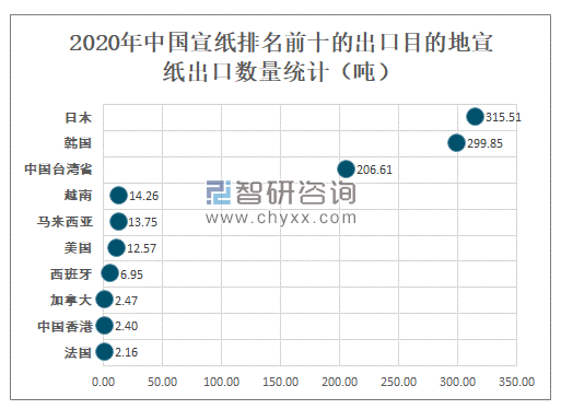 中国宣纸主要出口至日本、韩国、中国台湾省、越南、马来西亚、美国、西班牙、加拿大、中国香港、法国等地,2020年中国出口至日本宣纸的出口数量为315.50吨;出口至韩国宣纸的出口数量为299.85吨;出口至中国台湾省宣纸的出口数量为206.60吨;出口至越南宣纸的出口数量为14.25吨;出口至马来西亚宣纸的出口数量为13.74吨;出口至美国宣纸的出口数量为12.57吨;出口至西班牙宣纸的出口数量为6.95吨;出口至加拿大宣纸的出口数量为2.46吨;出口至中国香港宣纸的出口数量为2.40吨;出口至法国宣纸的出口数量为2.16吨。