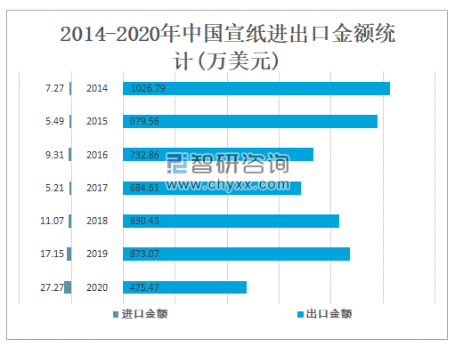 2020年中国宣纸进口金额为27.27万美元,较2019年增加了10.12万美元;出口金额为475.47万美元,较2019年减少了397.6万美元。