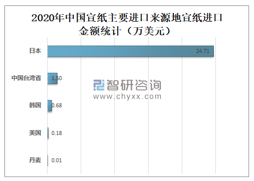 2020年中国从日本进口宣纸的进口金额为24.71万美元;从中国台湾省进口宣纸的进口金额为1.50万美元;从韩国进口宣纸的进口金额为0.68万美元;从美国进口宣纸的进口金额为0.18万美元;从丹麦进口宣纸的进口金额为0.01万美元。