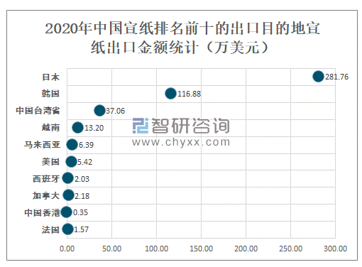 2020年中国宣纸排名前十的出口目的地宣纸出口均价统计
