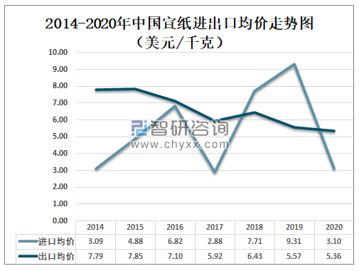 总体来看中国宣纸出口均价呈下滑趋势,进口均价则波动较大。2020年中国宣纸进口均价为3.1美元/千克,较2019年减少了6.21美元/千克;出口均价为5.36美元/千克,较2019年减少了0.21美元/千克。
