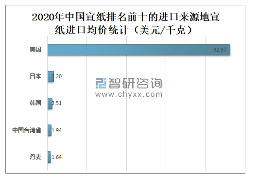 2020年中国从美国进口宣纸的价格最高,2020年中国从美国进口宣纸的进口均价为92.37美元/千克;从日本进口宣纸的进口均价为3.20美元/千克;从韩国进口宣纸的进口均价为2.51美元/千克;从中国台湾省进口宣纸的进口均价为1.94美元/千克;从丹麦进口宣纸的进口均价为1.64美元/千克。