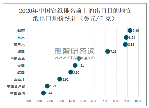 2020年中国出口至越南宣纸的价格最高,2020年中国出口至越南宣纸的出口均价为9.26美元/千克;出口至日本宣纸的出口均价为8.93美元/千克;出口至加拿大宣纸的出口均价为8.85美元/千克;出口至法国宣纸的出口均价为7.25美元/千克;出口至马来西亚宣纸的出口均价为4.65美元/千克;出口至美国宣纸的出口均价为4.31美元/千克;出口至韩国宣纸的出口均价为3.90美元/千克;出口至西班牙宣纸的出口均价为2.92美元/千克;出口至中国台湾省宣纸的出口均价为1.79美元/千克;出口至中国香港宣纸的出口均价为1.44美元/千克。