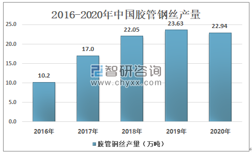 智研咨询发布的《2021-2027年中国胶管钢丝产业竞争现状及投资前景分析报告》显示:作为橡胶骨架材料的细分产品之一,胶管钢丝是随着橡胶骨架材料行业的发展而发展的。根据中国橡胶工业协会不完全统计:2019年中国胶管钢丝产量为23.63万吨;2020年中国胶管钢丝产量为22.94万吨,同比下降2.9%。随着市场需求的扩大,其行业发展潜力巨大。